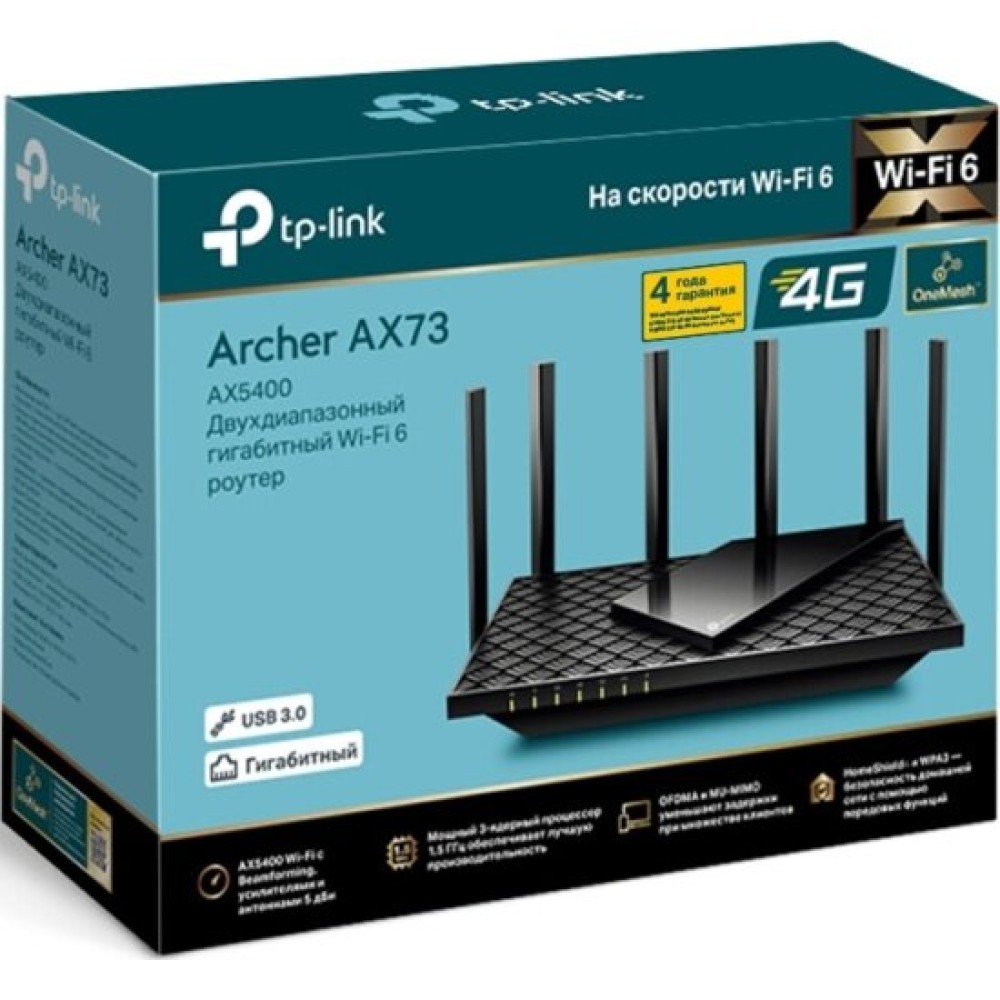 Комплектация: wi-fi роутер Archer AX73, адаптер питания, кабель Ethernet RJ45, руководство по быстрой настройке; система безопасности HomeShield